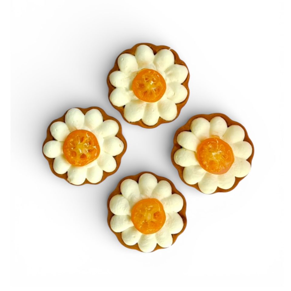 タルト屋ならではの工夫で小さな花をかたどって焼き上げたタルト生地にキャラメル風味のフィナンシェ生地、レモンのジャムを重ね、金柑とクリームで花冠をイメージして仕上げた”春”の始まりにぴったりの可愛らしいタルトです。