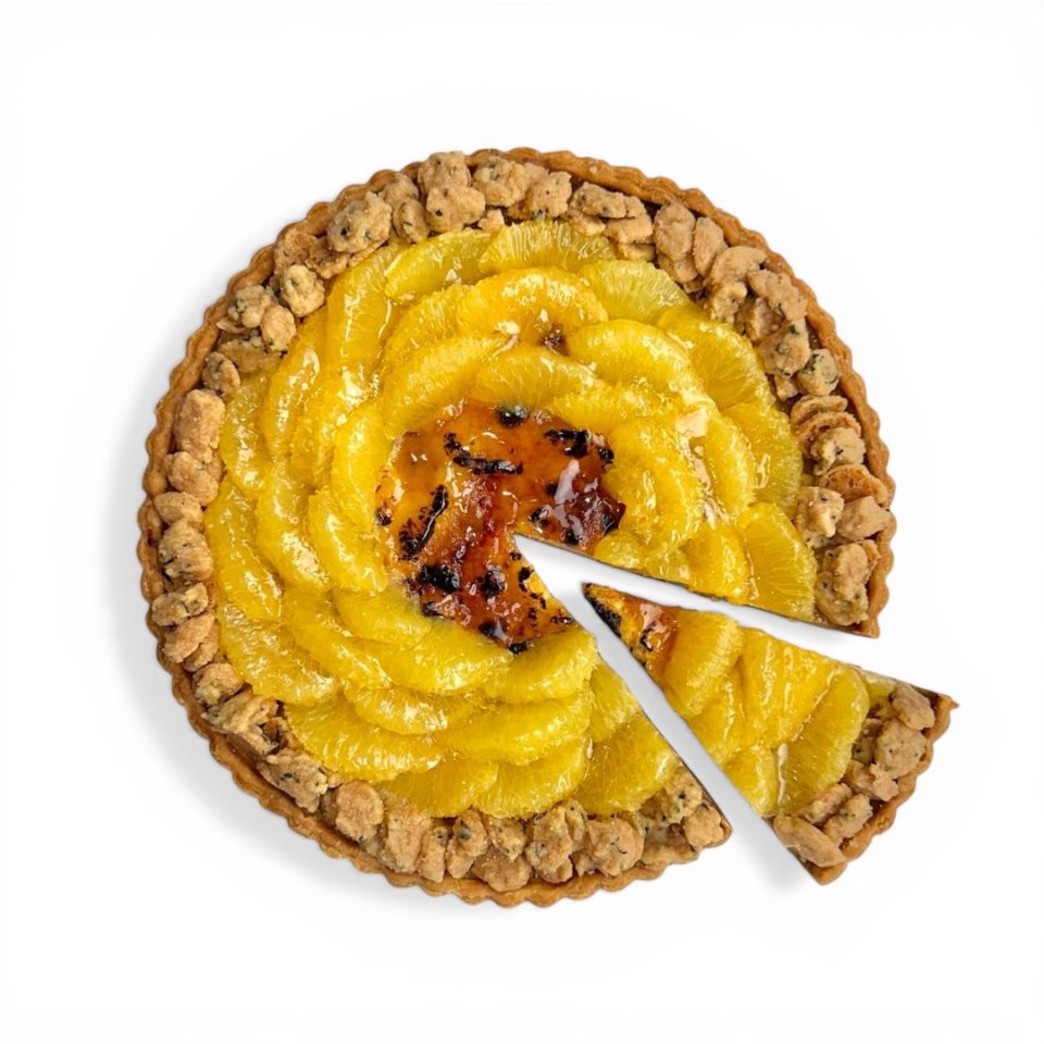 その美生柑の果実をタルト生地に敷き詰め、美生柑のピールをすりおろして香りを移したアーモンドクリームとアールグレイ風味のプリン生地を重ねて焼き上げたベースに、トップはフレッシュの美生柑と、これまたアールグレイ風味にしたカリカリのクランブルを配して仕上げていますので、火を通して甘味が増した美生柑とフレッシュジューシーな美生柑双方の美味しさがアールグレイによって引き立ちながら一度に楽しめるタルトになっています。